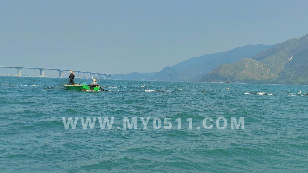 出海看海豚,我个人猜测是小概率的机会可以看到,事实上也应该如此,驾驶员把我们带到能看到港珠澳大桥的海域(也算近的),我们就停在海面