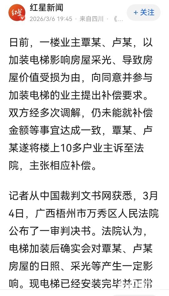 住宅加装电梯,1楼业主以影响采光和房价起诉,一审判楼上14户业主补偿2.1万元