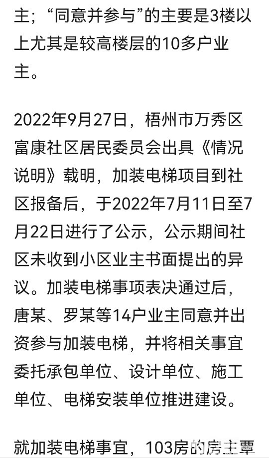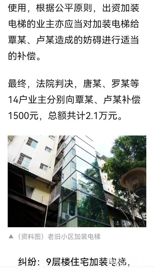 » 住宅加装电梯,1楼业主以影响采光和房价起诉,一审判楼上14户业主补偿2.1万元