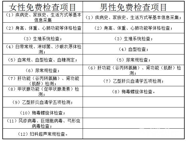 备孕检查,男女免费项目看下表。孕期免费检查项目是唐氏筛查。