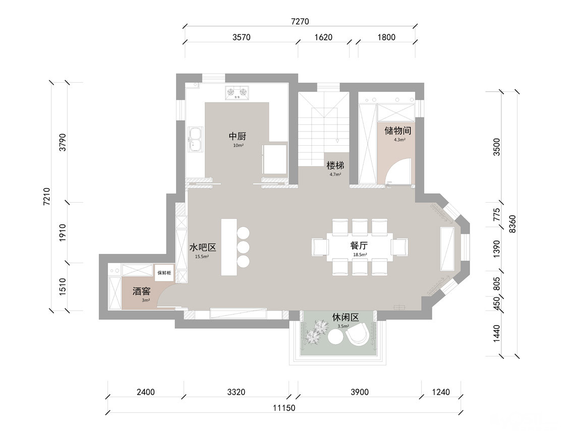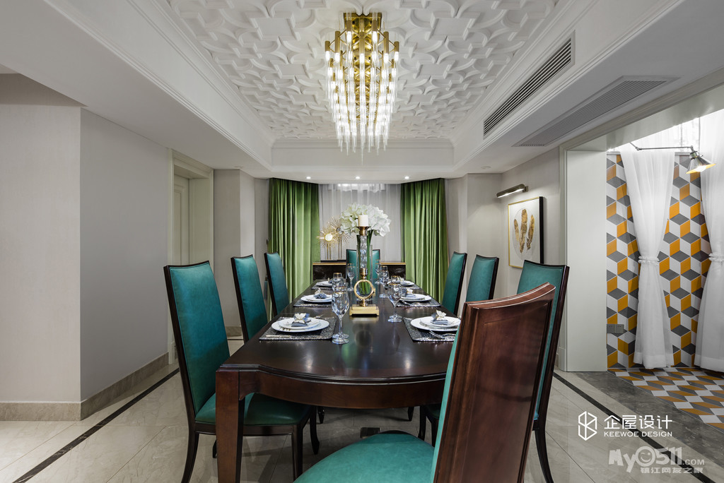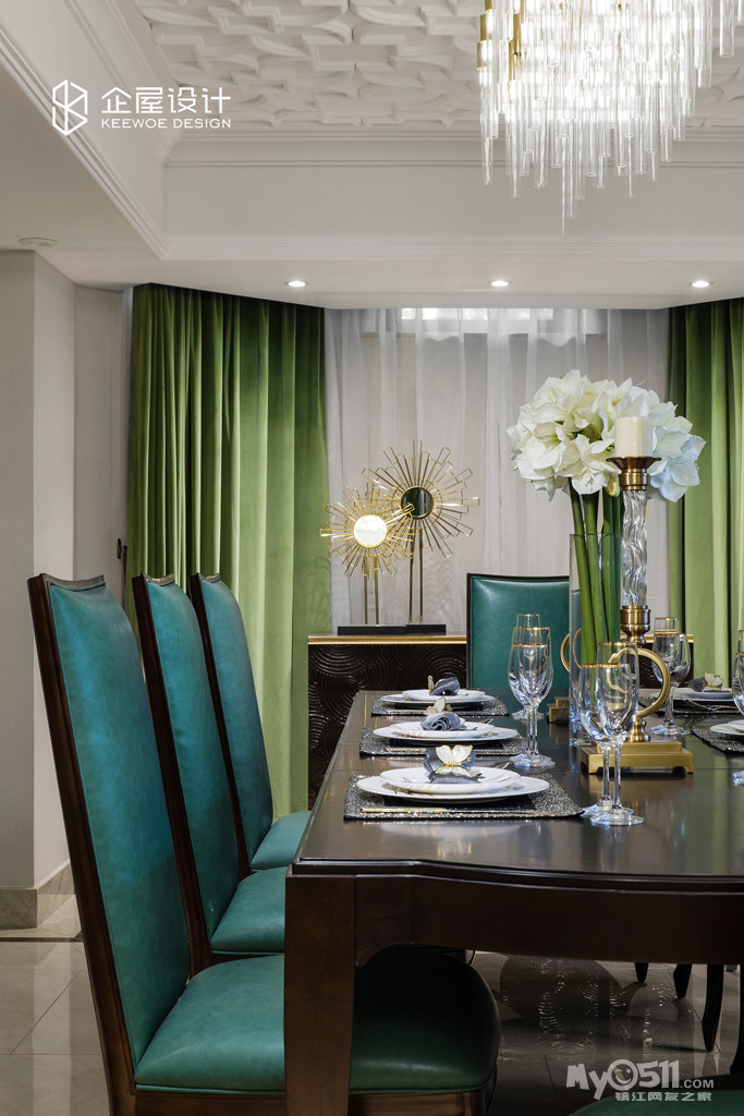 餐厅的桌椅颜色采用墨绿色,让整个空间的色彩有了变化,也使餐厅成为一个独立的空间。