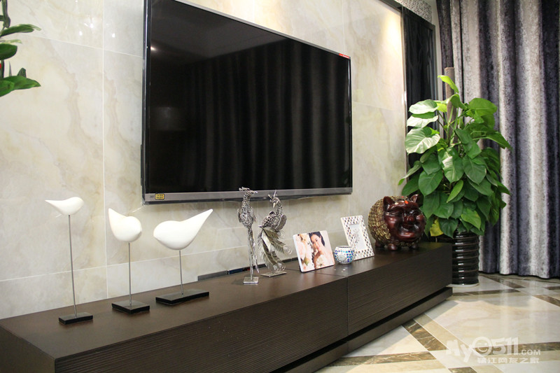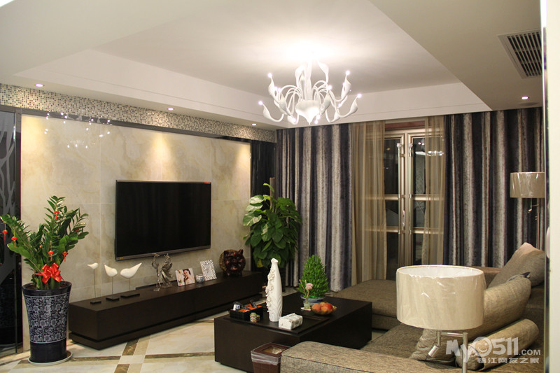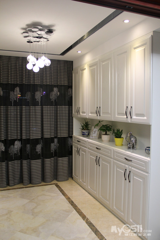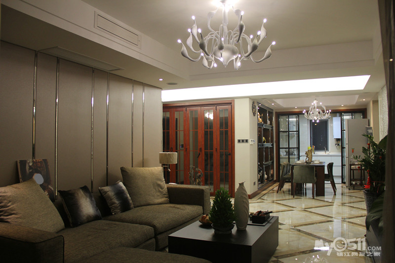 本案以舒适为基础,常用大理石砖、华丽多彩的墙纸窗帘、优雅的硬包、镜面移门等让室内显示出华丽、安静的特点。本案为一家三口改善房,3房2厅2卫加入户花园及大阳台,此户型空间比较大,入户花园一整面的到顶鞋柜,满足了女主人鞋分开放的要求。门厅加了折叠门隔开,增强了空调效果,也一定程度上起到玄关作用。客厅大块面的硬包材质运用手法使空间显得简洁大气,点线面的关系干净明快。接近黑色的家具内敛而不张扬,布艺沙发的柔性与电视墙大理石砖的刚性相呼应,使得空间气质得以提升。全屋色彩以中性色为主,稳重而平易近人,低调中略显奢华。