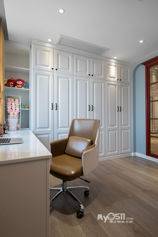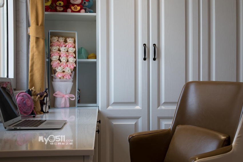 女儿房是将两个小卧室合并成的,空间整合后做了配套的书桌+储物衣柜,考虑到餐厅北面的采光问题,所以将书桌区域与餐厅隔墙做了落地假窗,卧室内配上纱帘,让空间变得通透有情趣但又不影响隐私