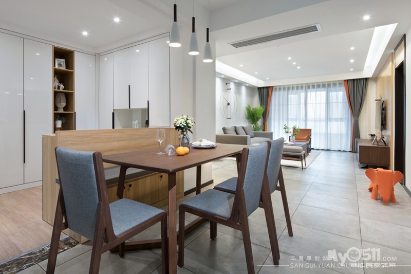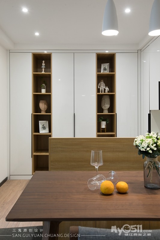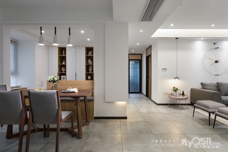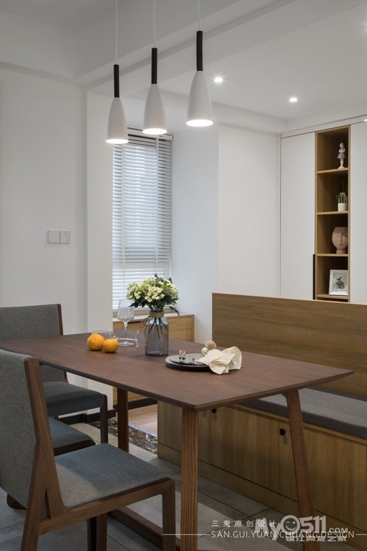 餐厅与储物间合并,利用储物间的空间做个卡座,这样餐桌就能靠边摆放,腾出走人的动线出来。