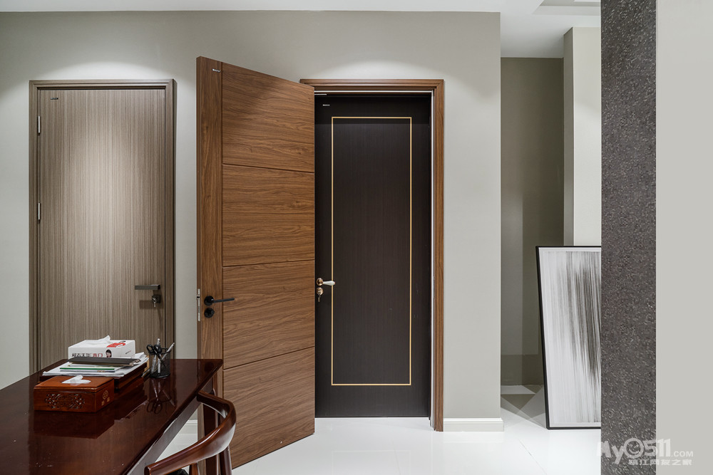 他家有免漆门和实木复合门,本次团队两类门均参加,我意向的是实木复合门。门芯是用长白山松木切割成单板纵横交错排列的。门厚45mm,使用德国豪迈封边机四周封边,有效防潮。门套是25mm实木门套,并且内侧有有机分子防潮平衡膜,有效隔离潮气。门套有多重要用过门的都知道,反正我家现在用的门门套是密度板的,握钉力就不提了,十年下来,一扇门铰链已经脱落,直接换门了,其他几扇门我怀疑随时有掉下来的可能…油漆使用的水性油漆,我坚定认为水性漆是最环保的油漆,三底,三色,三面共九遍工艺,还可升级净化门。