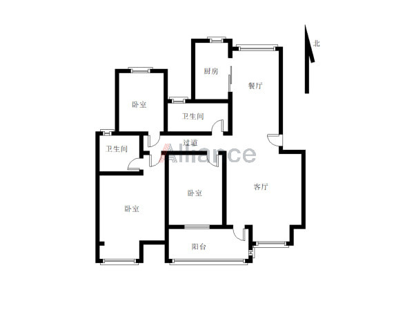 此房三开间朝南 一室和厨房朝北 南北通透户型 双卫
