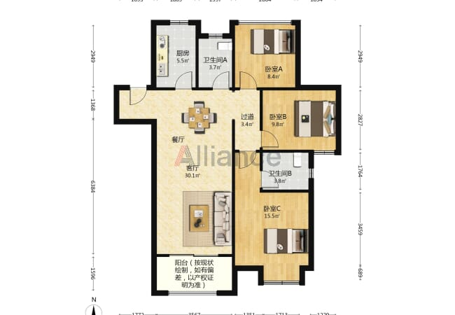 [二手房] 万达周边 润泽园三期精装边户106平清爽设全好楼层采光好环境优 三室二厅