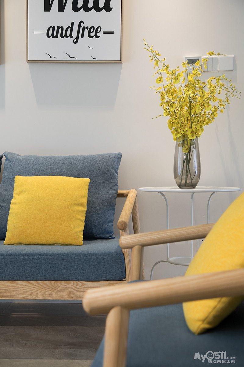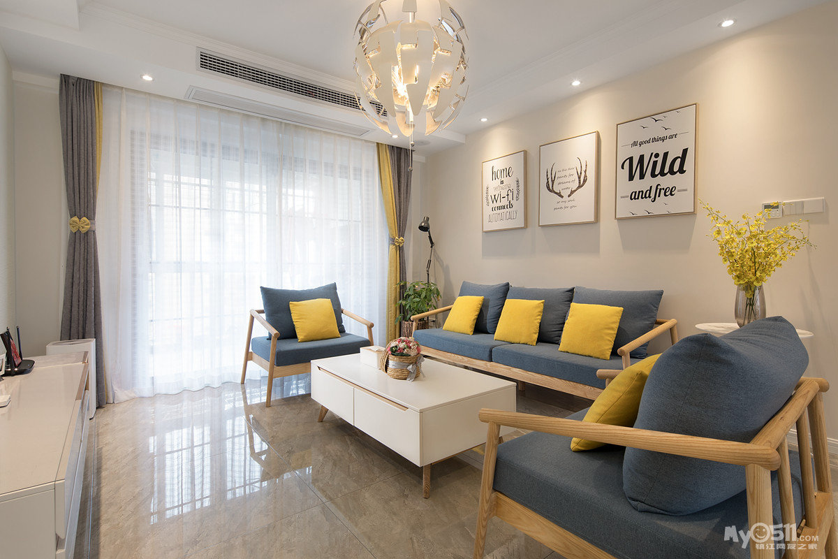 简洁大气的原木+灰蓝布艺沙发(这组沙发我心仪很久),地面则采用极为沉稳的灰色系大理石瓷砖,暖色乳胶漆墙面,整体基调追求自由随性。