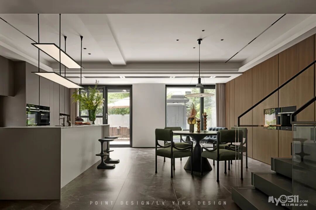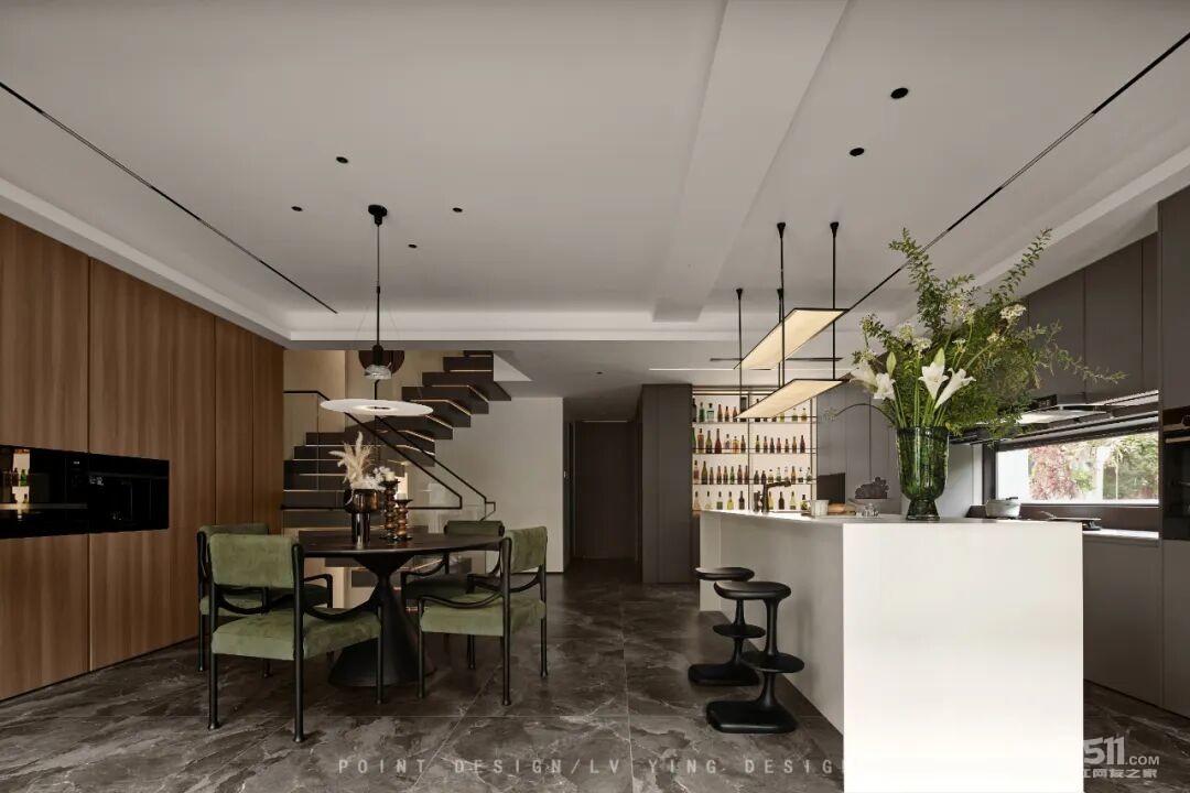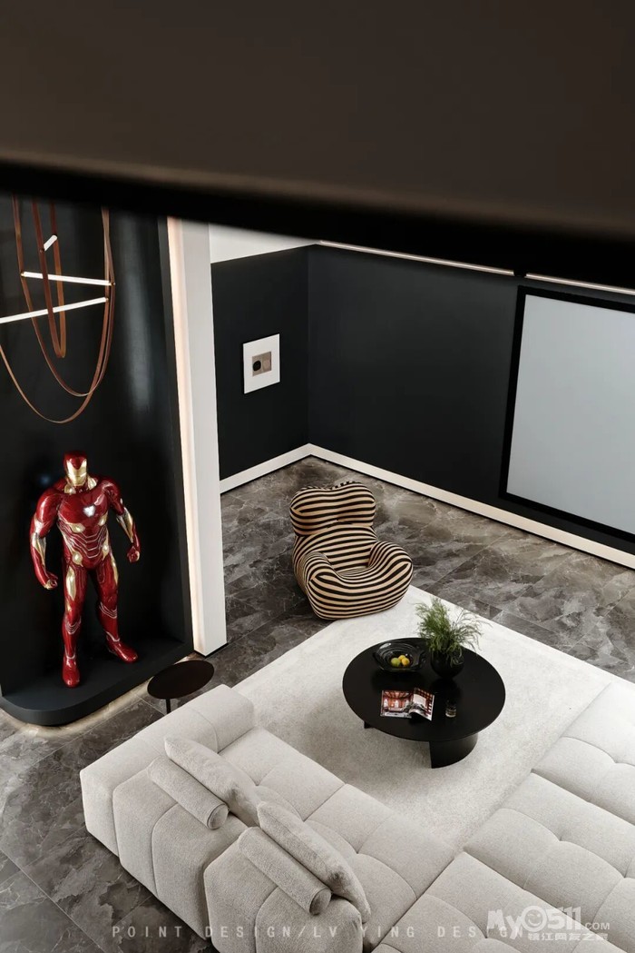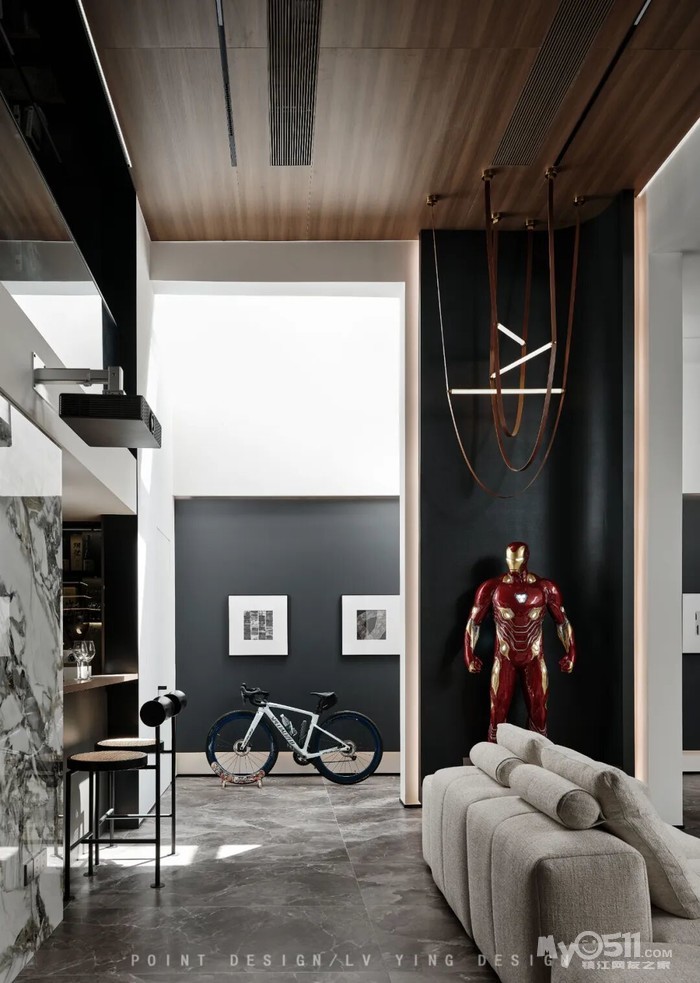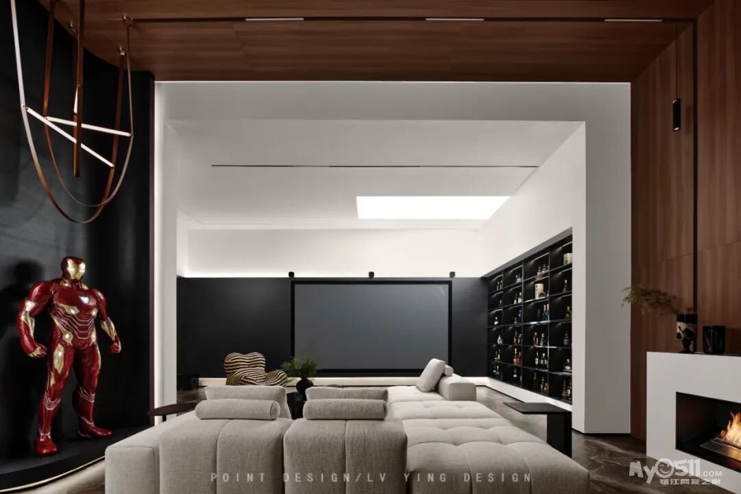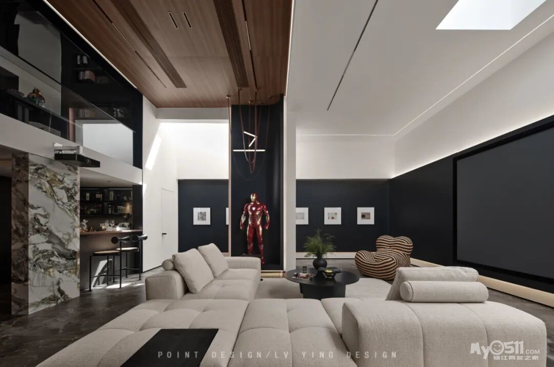 巧妙利用下叠户型的结构特点,将挑空的地下室作为整个家庭的社交核心——大客厅。挑空格局赋予了空间宏伟的尺度感,我们通过简洁的线条和体块关系去强化这种建筑美感,落地雕塑配合艺术吊顶自高处垂下,成为视觉焦点,天窗的自然光引入地下,彻底打破了传统地下空间的昏暗与闭塞,使其变为一个通透、明亮、与自然对话的场所。