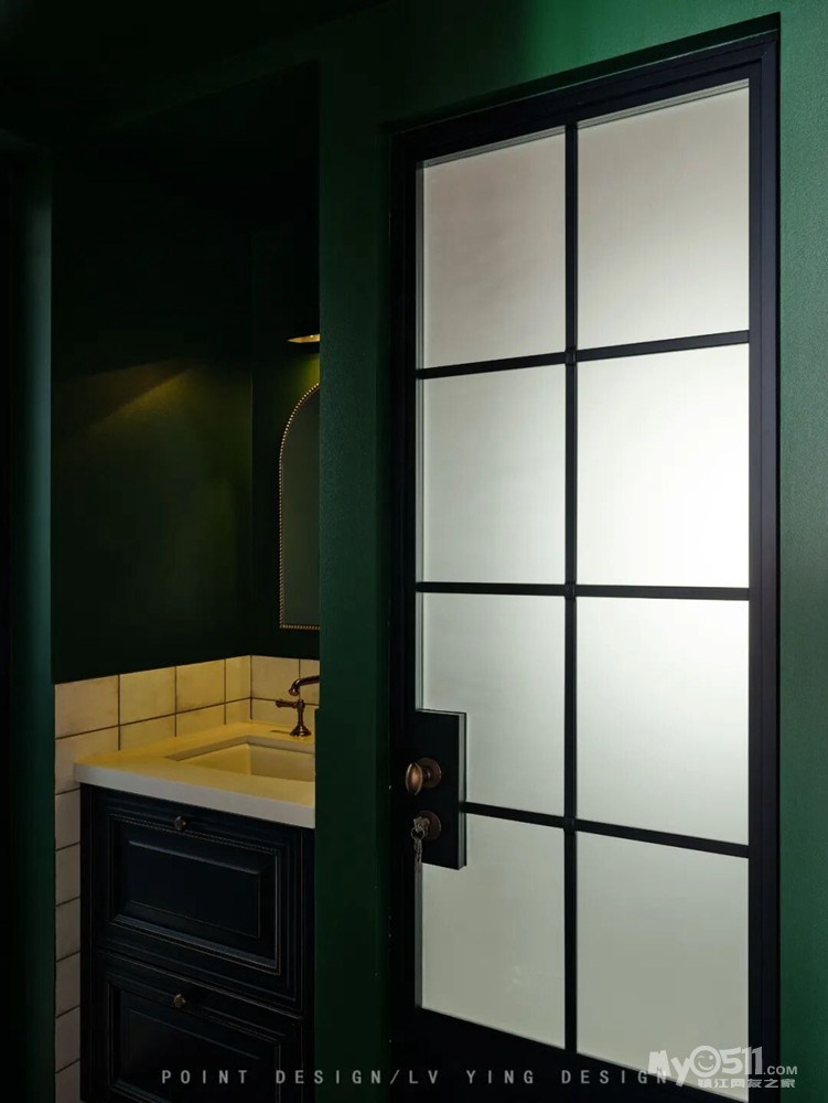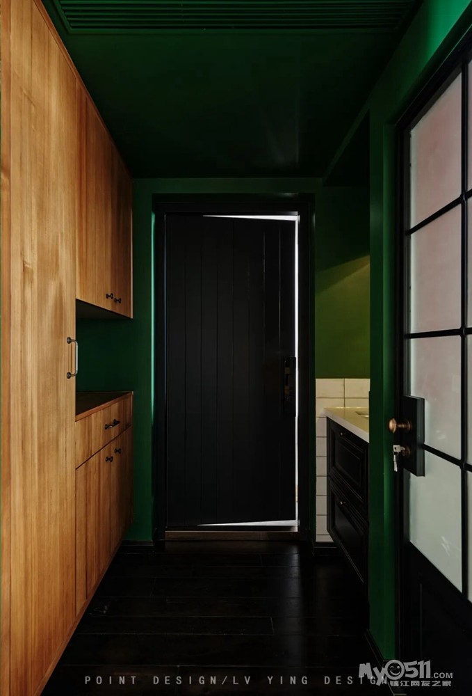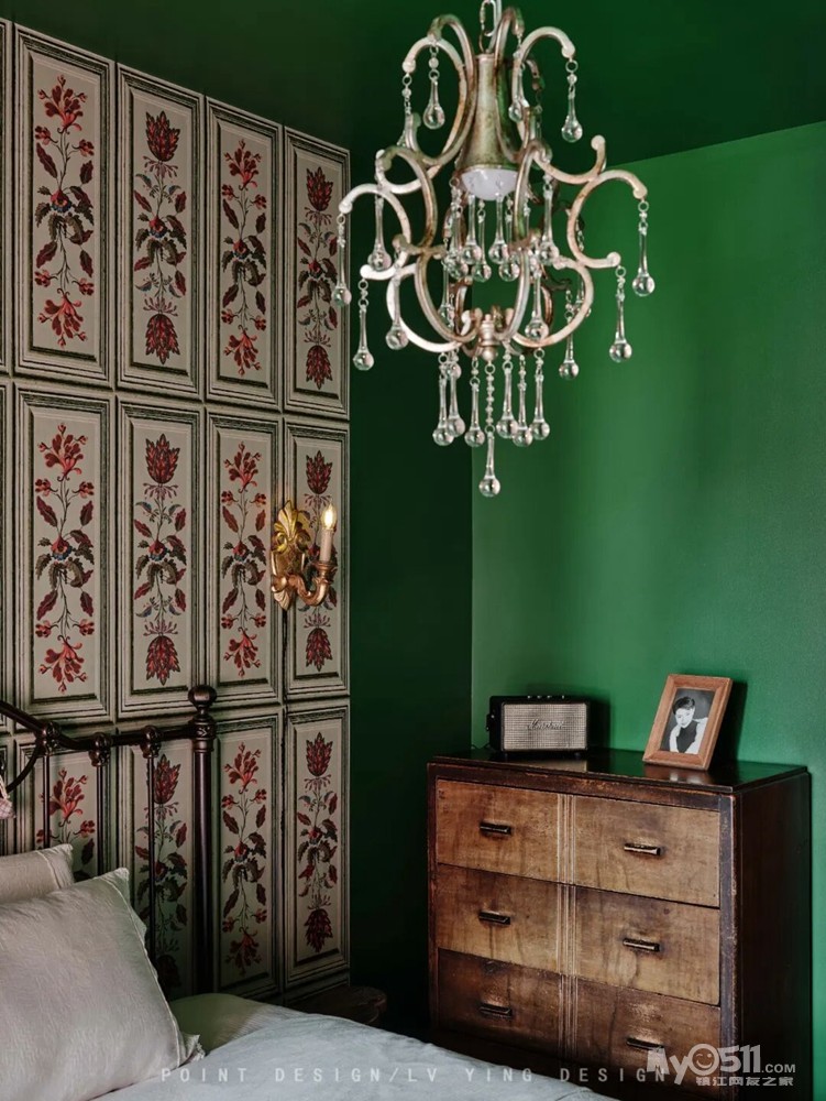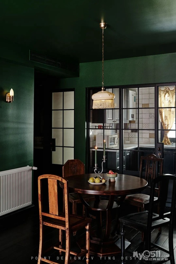 “墨绿” 锚定空间主色调的浓郁质感,“迷情” 传递色彩与复古元素交织的沉浸氛围,“复古艺术居” 点明设计的艺术调性与复古内核。