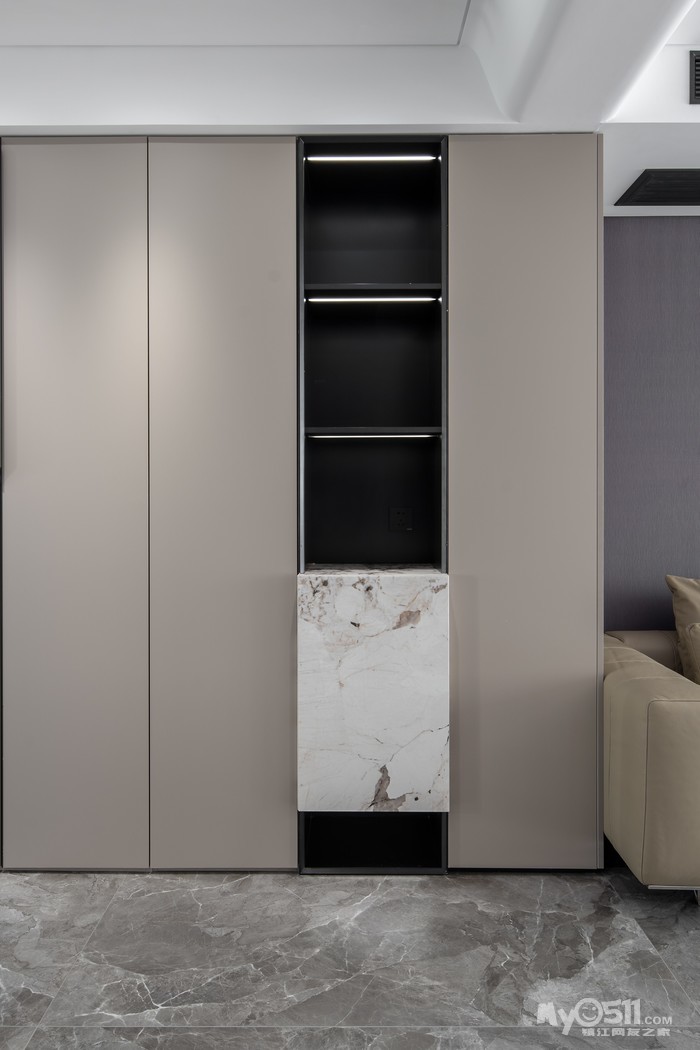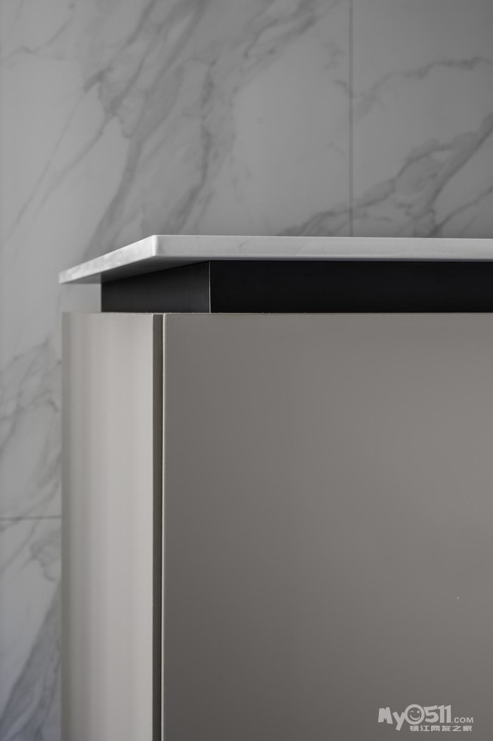 无把手设计的好处在于线条看上去会更加干脆利落,整体立面也更简洁,同时不用担心会磕碰到凸起的把手。本案选择的是斜切门板上侧的嵌入式把手设计。嵌入式把手就是在柜门上设计封闭型凹槽,在定制柜门的时候直接制作好,不需要添加其他配件。