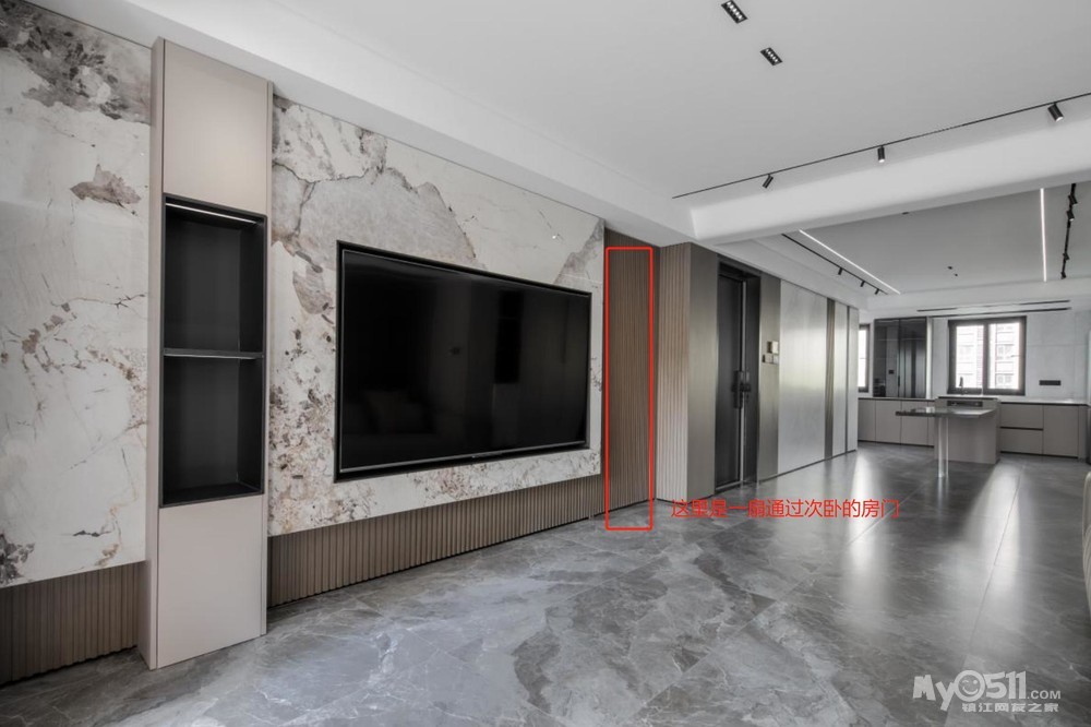 如何让隐形门更加隐形呢?万变不离其宗的就是想办法让隐形门与它所在的墙体融为一体,本案是通过格栅木饰面的设计,让门缝隐藏在格栅间隔中实现隐形。