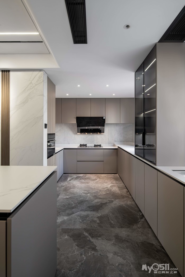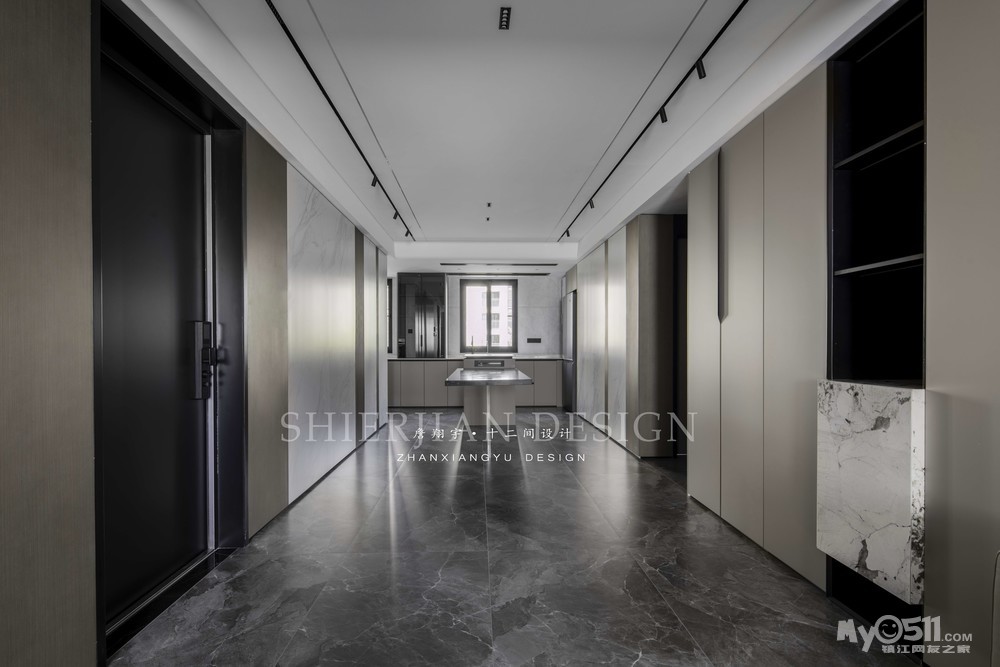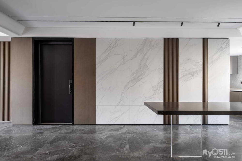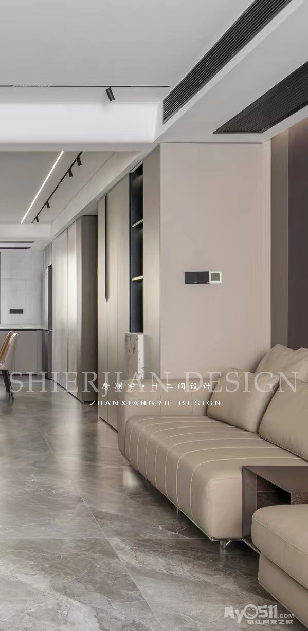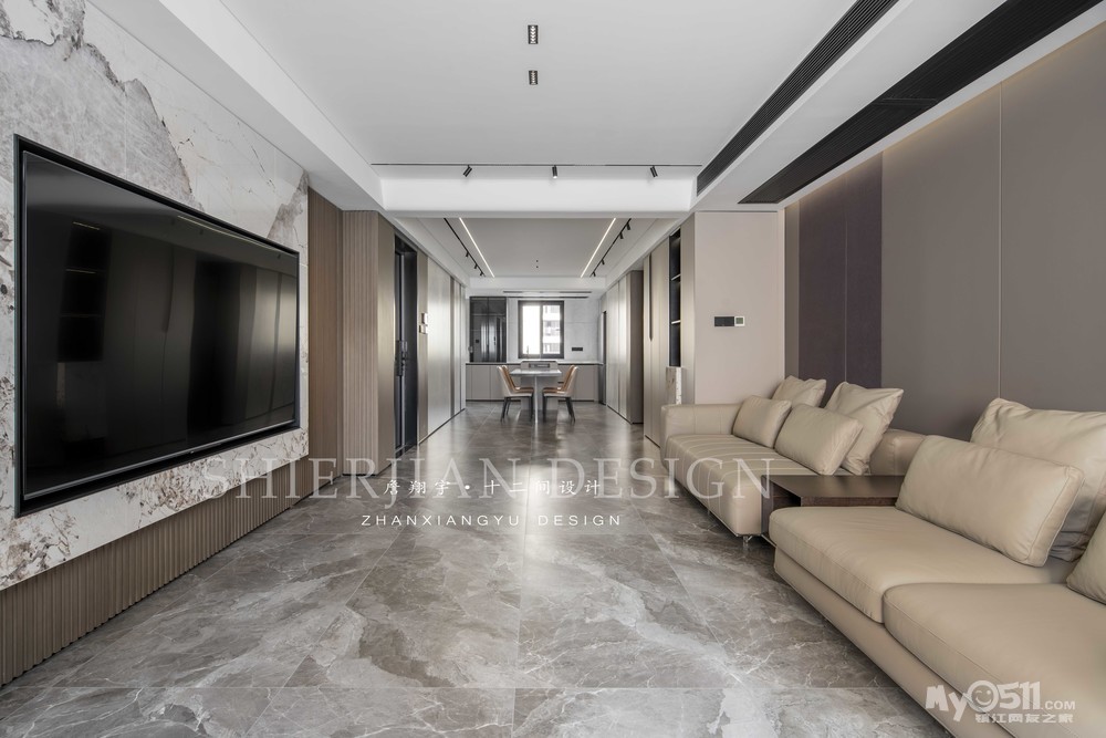 本案的阳台、客厅、餐厅、厨房一体南北通透,径深12米,通过不同材质的穿插实现墙面的协调统一。