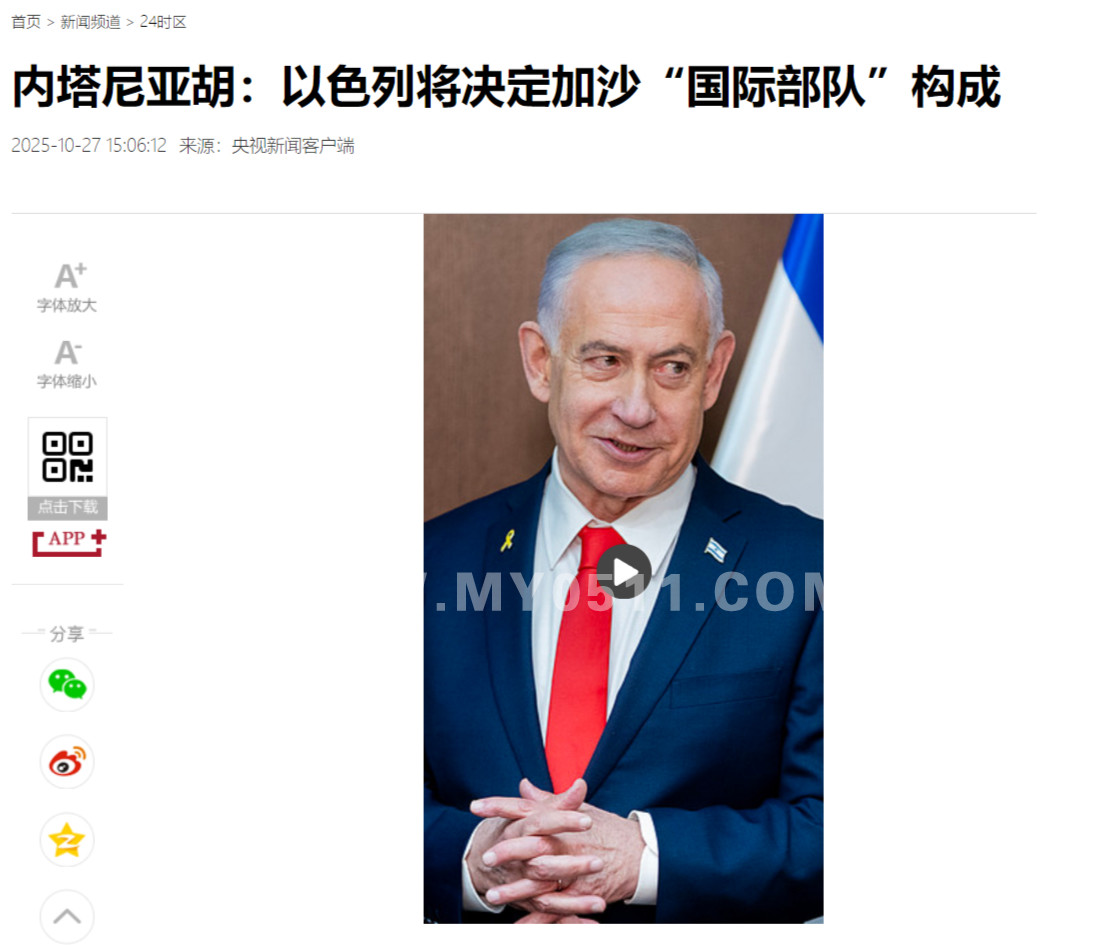 当地时间10月26日,以色列总理内塔尼亚胡在以内阁会议上称,对于将部署到加沙地带的“国际部队”,“以色列将决定哪些部队是我们无法接受的”。