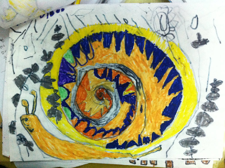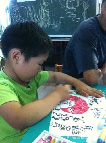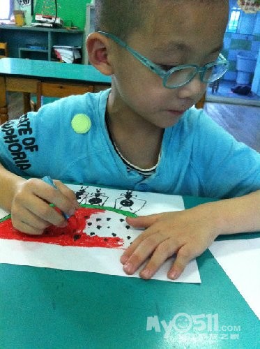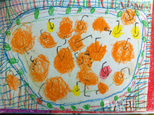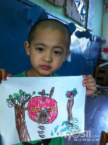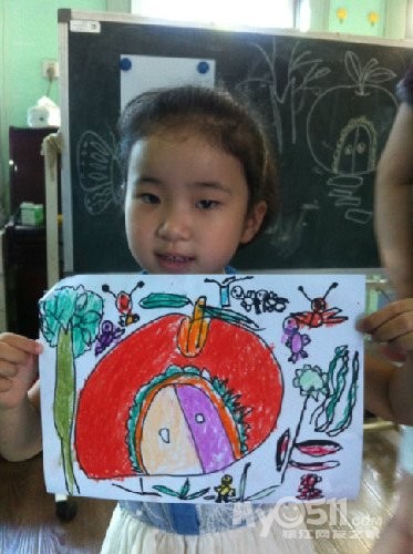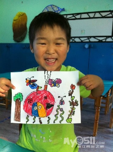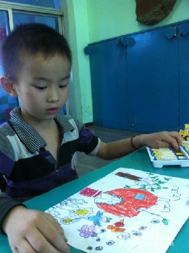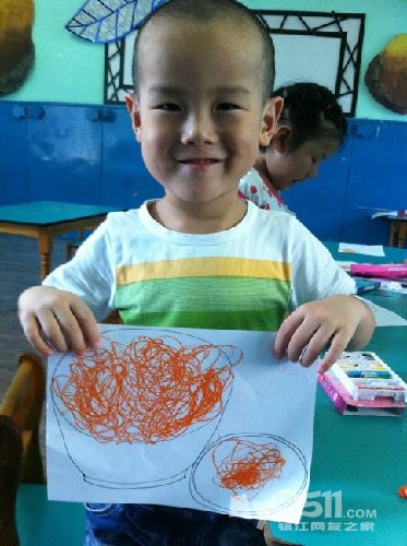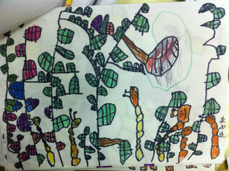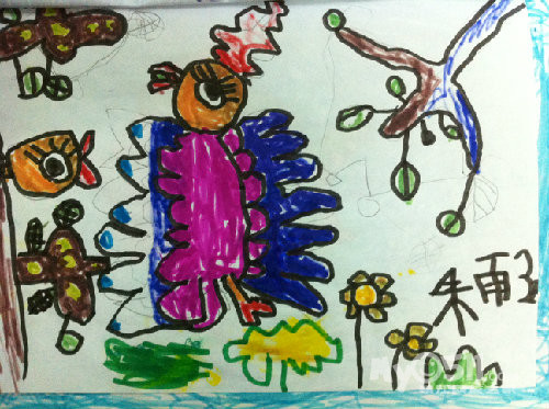 别人的毛毛虫也许只有一两条,而小雨每次总是埋着头,一定要把纸全部画满,你看,毛毛虫在吃苹果呢!这里要说的是,之所以把这幅作品,作为他的第一幅,是因为,在这之前,他的画线条很多也很乱,他会不停的画,而且还不喜欢用颜色,我知道,这是一个,内心世界及其丰富的孩子,于是,我让他,把想画的东西画大。。。。。慢慢的,他的画面,开始有变化了。。。。。。