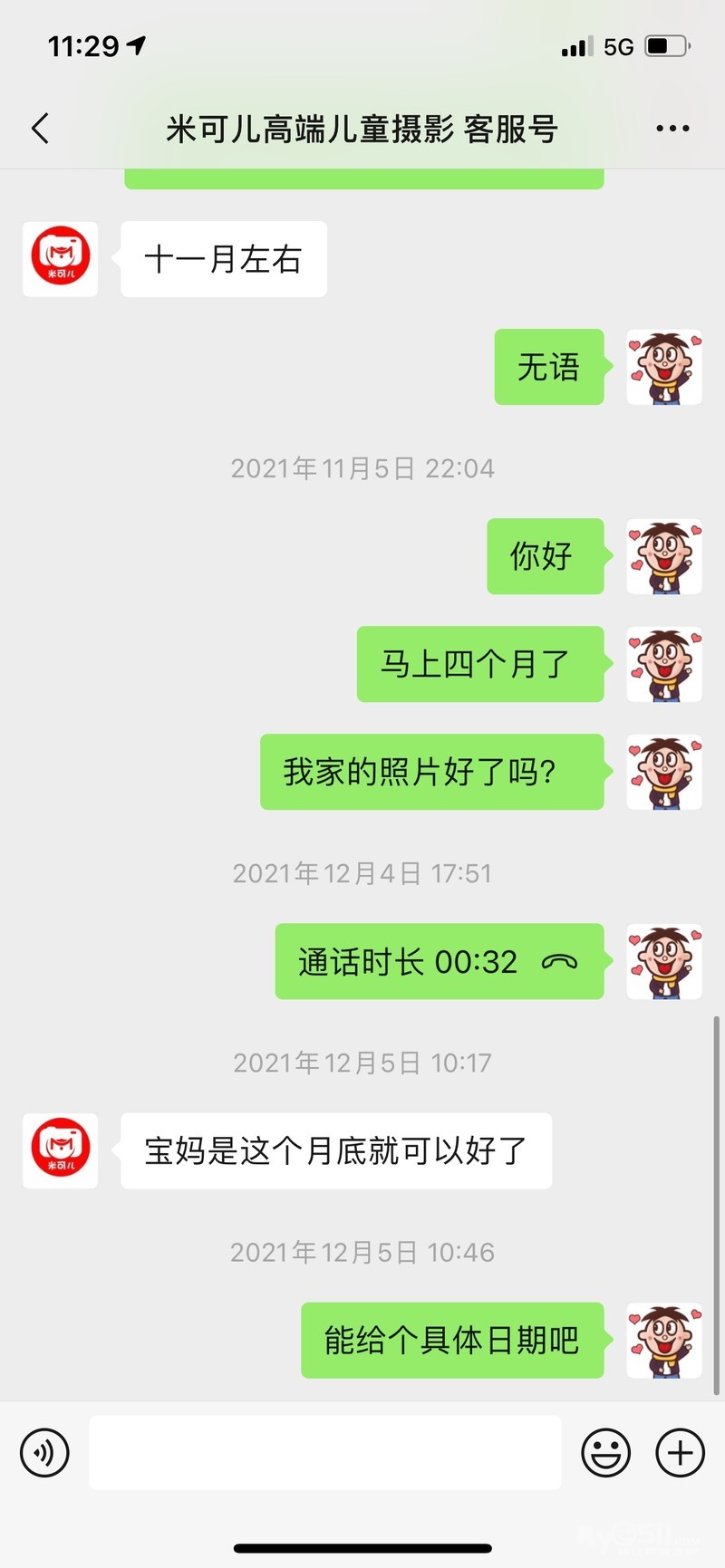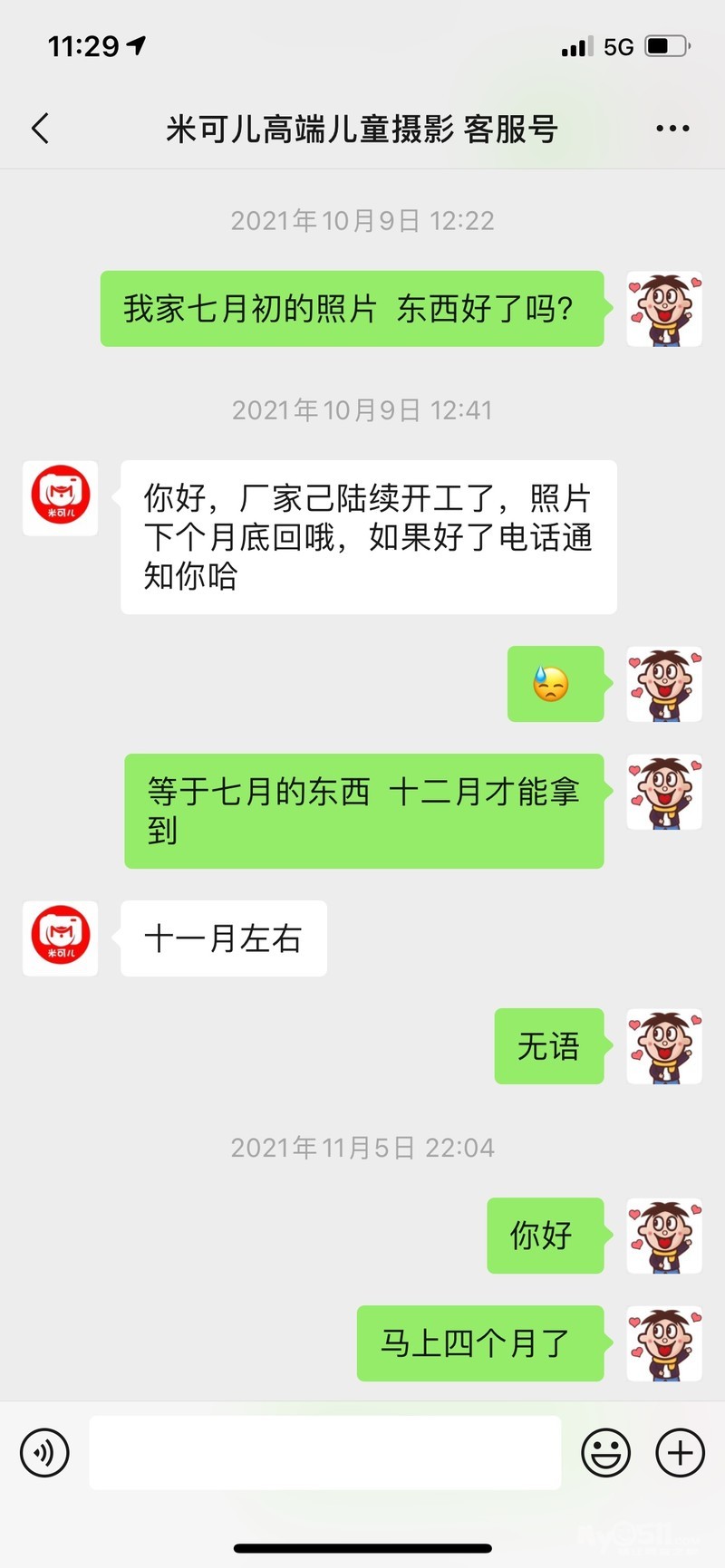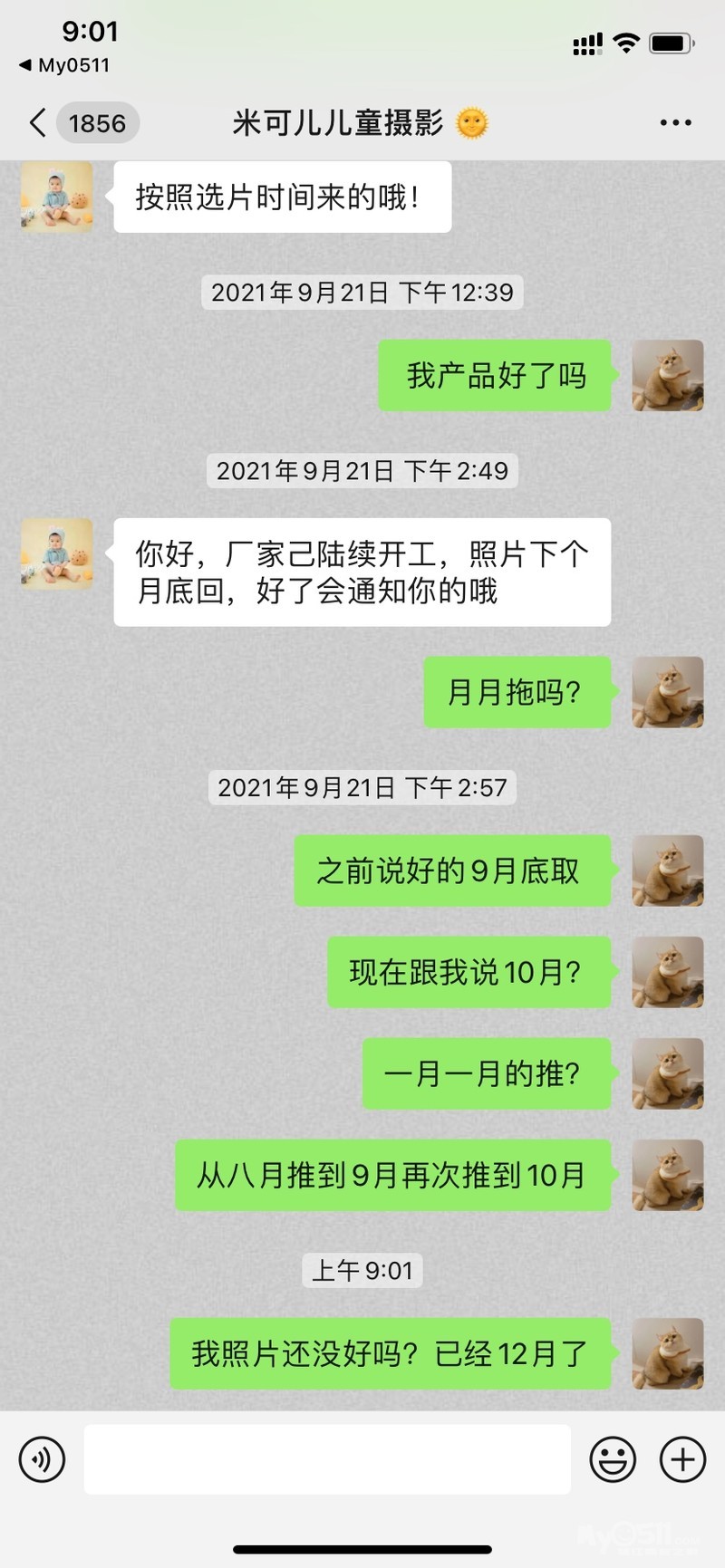 去拍照的时候让我多加了他家2个微信号,一起加了他家3个微信号,说是方便到时候发样片给我看。由于我本人工作比较忙,也一直把这事给忘了。期间在今年9月30号我给他家其中一个微信发了消息问相册什么时候好,那人回复说第二天上班给我查下,后来就没有下文了。直到这几天我才又想起来这事,在我12月11号再次给他家微信发消息无果后,我于今天先给他家座机打的电话,一个女的接的,查询了我资料以后,说不清楚,要等他们店长来再告诉我,我直接让他提供店长的电话给我,我先用座机打了2个没接,后又用我的手机给她打了2个也没接,接着她回过来了,也是搞笑的很,本身我就是带着一肚子怒气的,而他家从头之尾没有一个人对我说声抱歉什么的,还跟我说是过年什么的,我请问你们我照片是才拍的吗?8个月一个相册做不好?!2分钟的电话只会噢噢噢,听着就火大,气的我把电话挂了。订套系之前一副嘴脸,现在又是另外一副嘴脸,现在我感觉他们才是上帝。